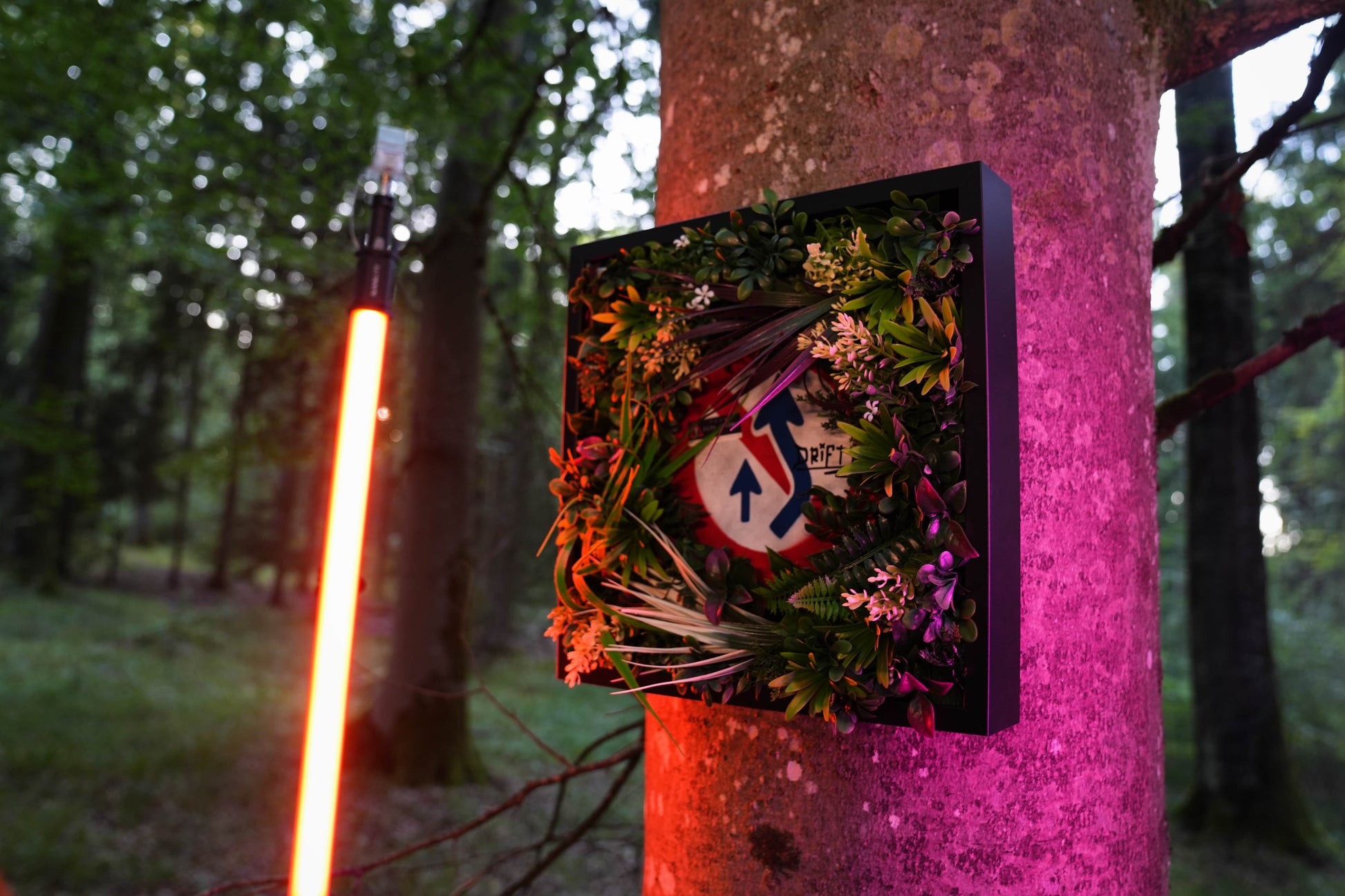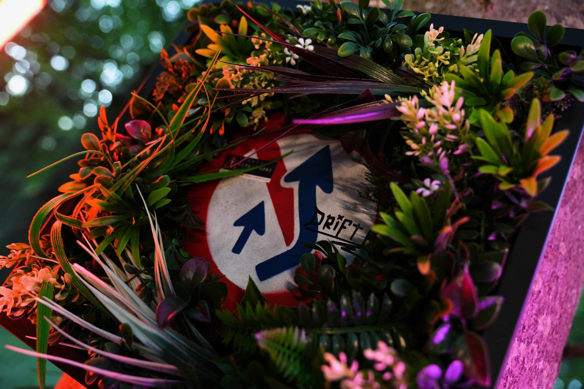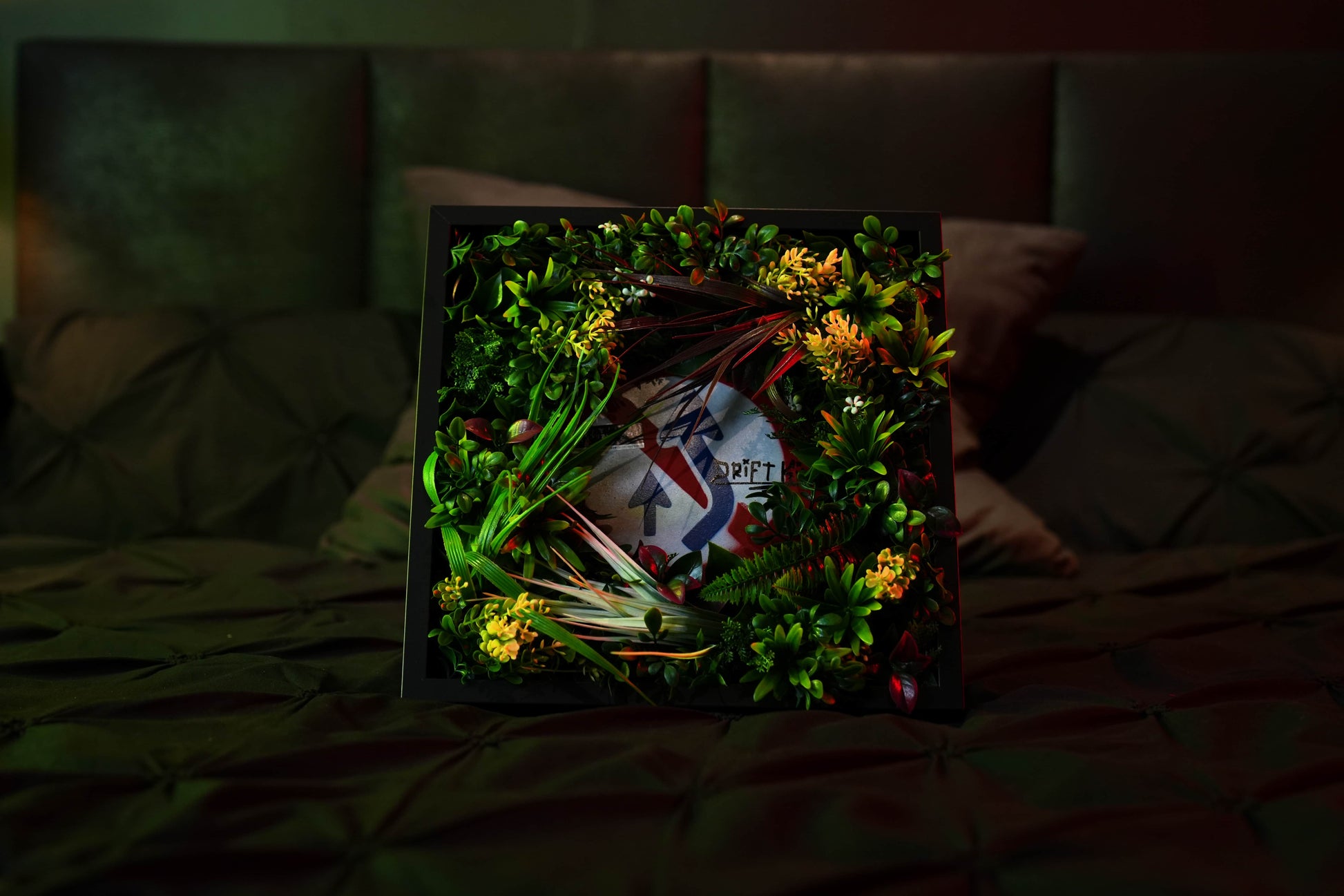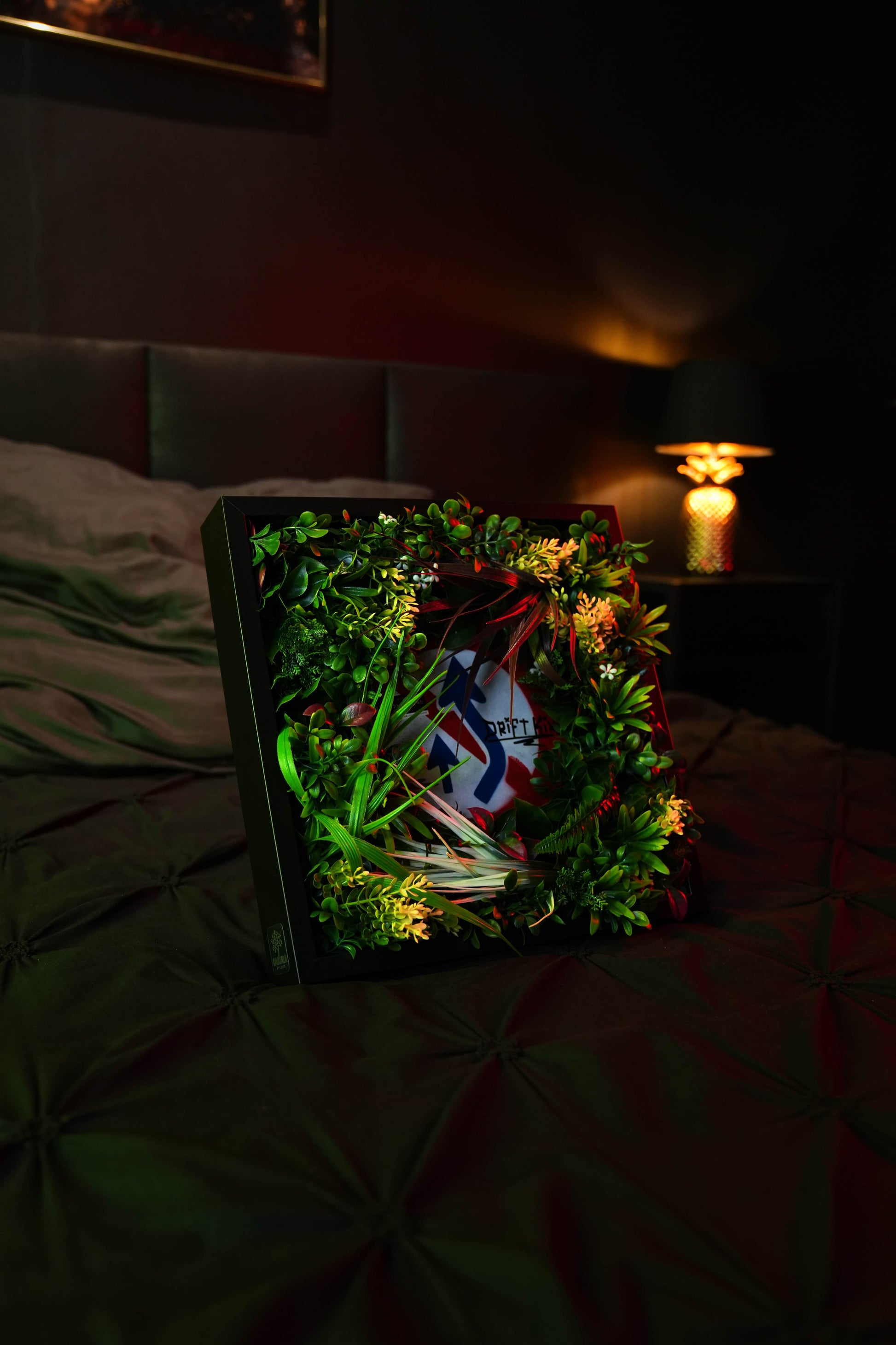 This piece features a hand-sprayed vintage Japanese street sign, evoking the spirit of "DRIFT KING" and the excitement of illegal drifting. Surrounded by a lush array of faux greenery, the sign is mounted within a shadow box frame, merging elements of street culture and nature. The vibrant plant accents contrast with the gritty aesthetic of the sign, creating a captivating blend of rebellion and style.