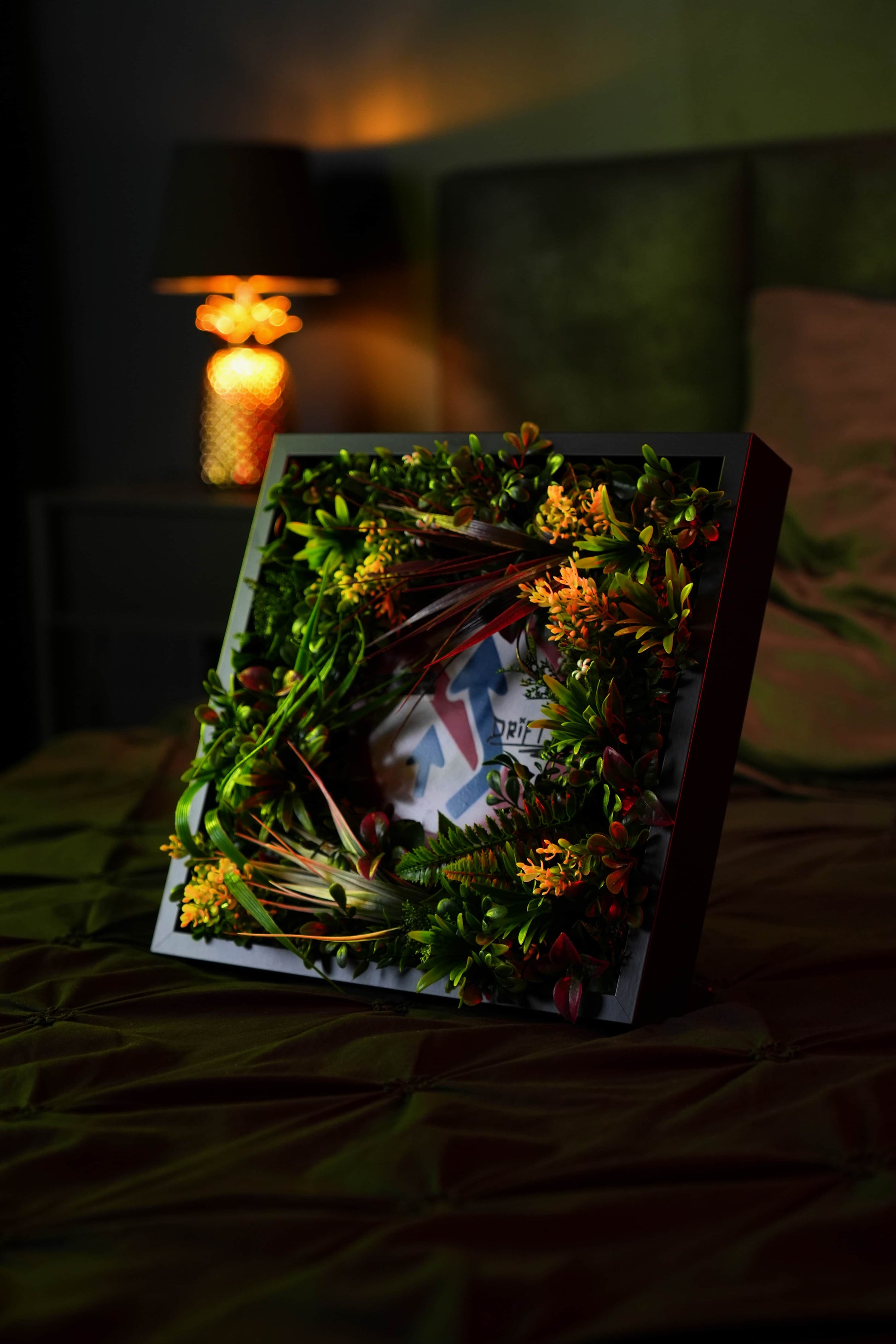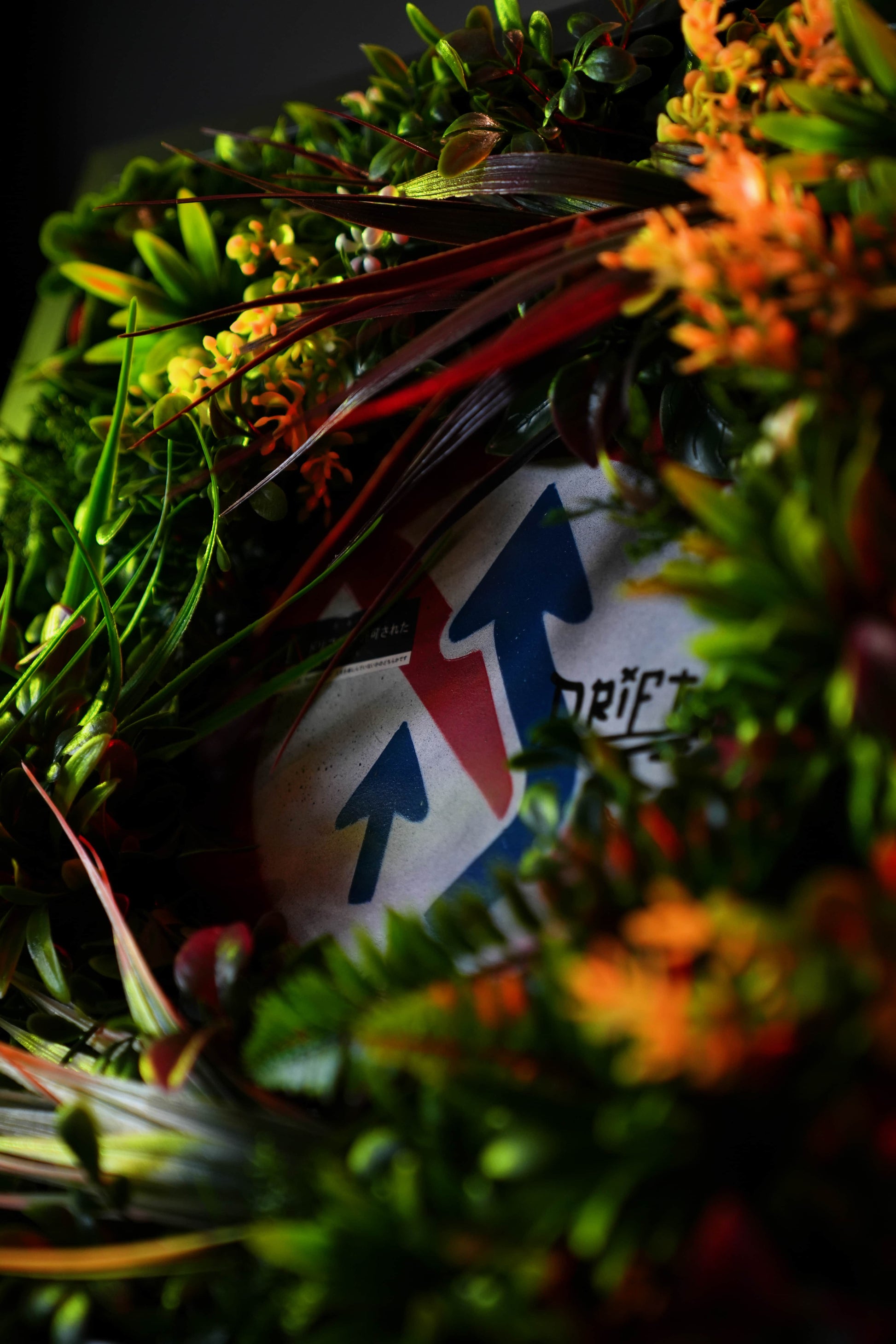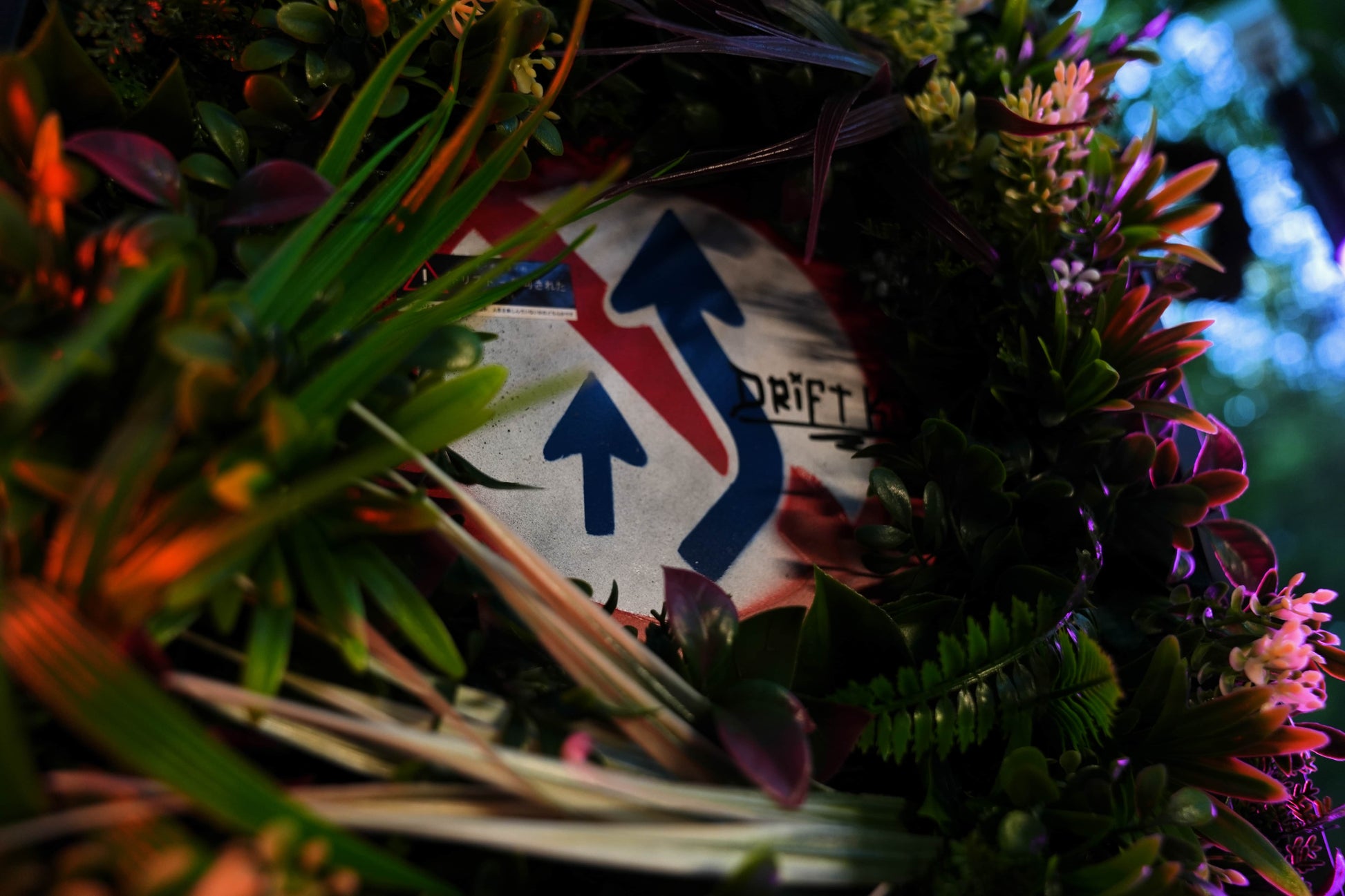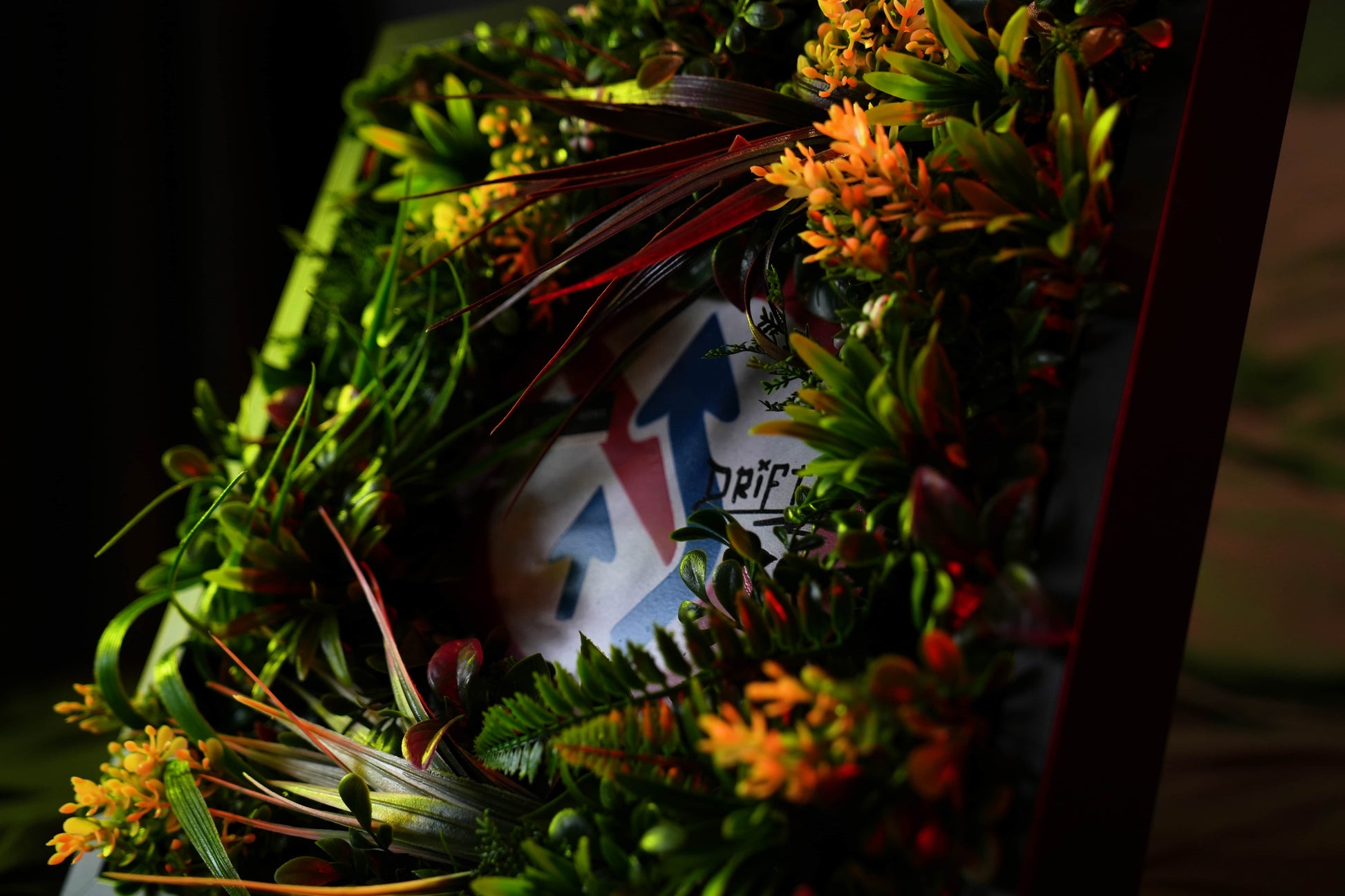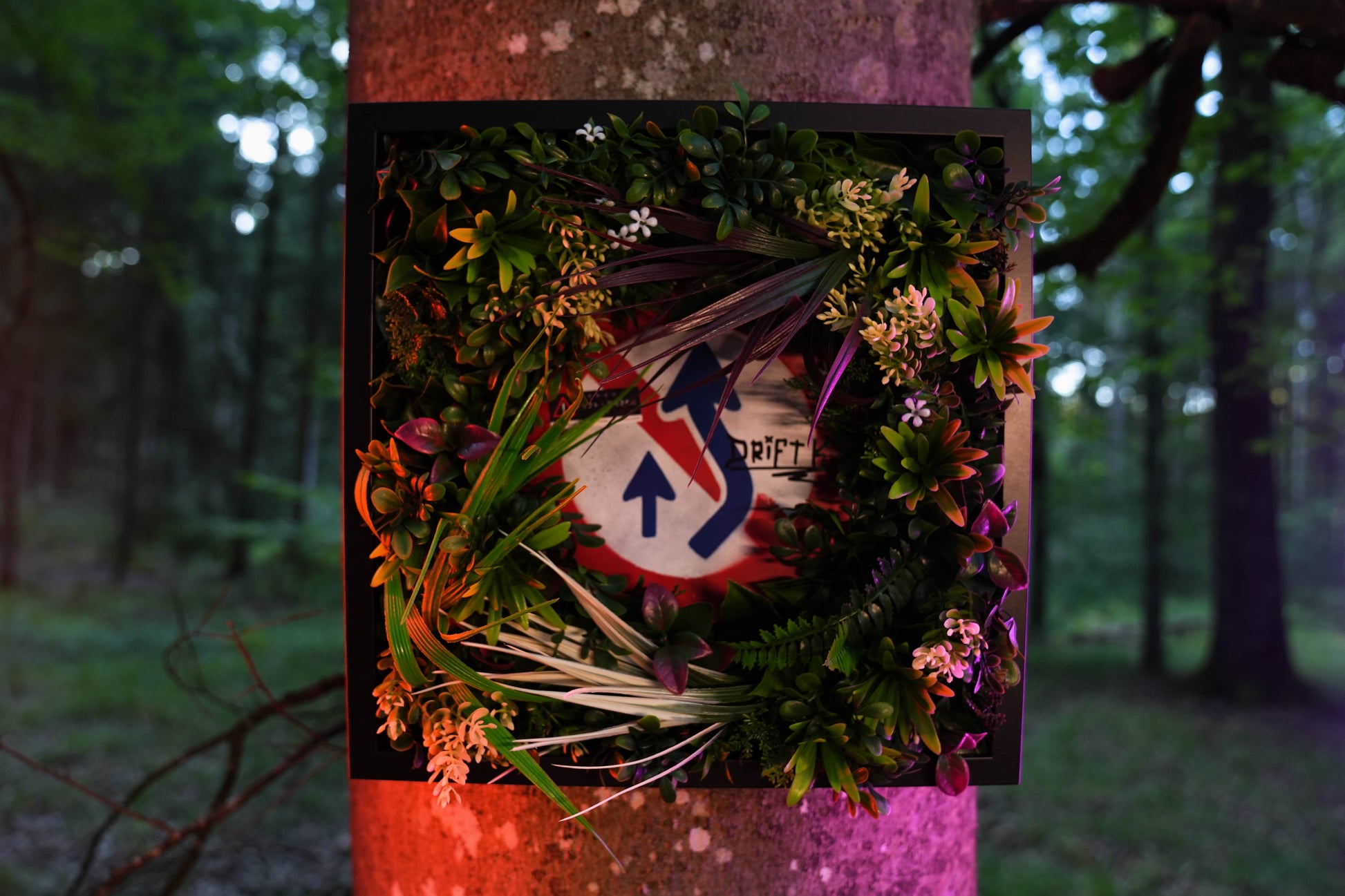 This piece features a hand-sprayed vintage Japanese street sign, evoking the spirit of "DRIFT KING" and the excitement of illegal drifting. Surrounded by a lush array of faux greenery, the sign is mounted within a shadow box frame, merging elements of street culture and nature. The vibrant plant accents contrast with the gritty aesthetic of the sign, creating a captivating blend of rebellion and style.