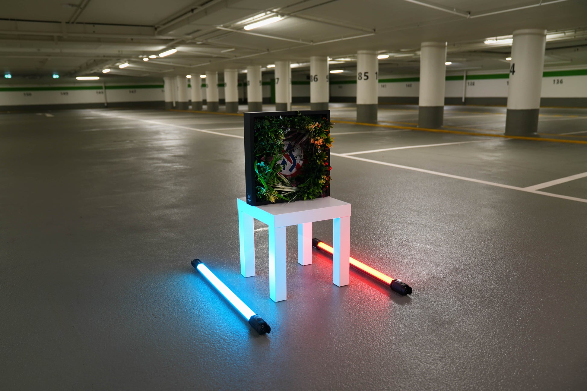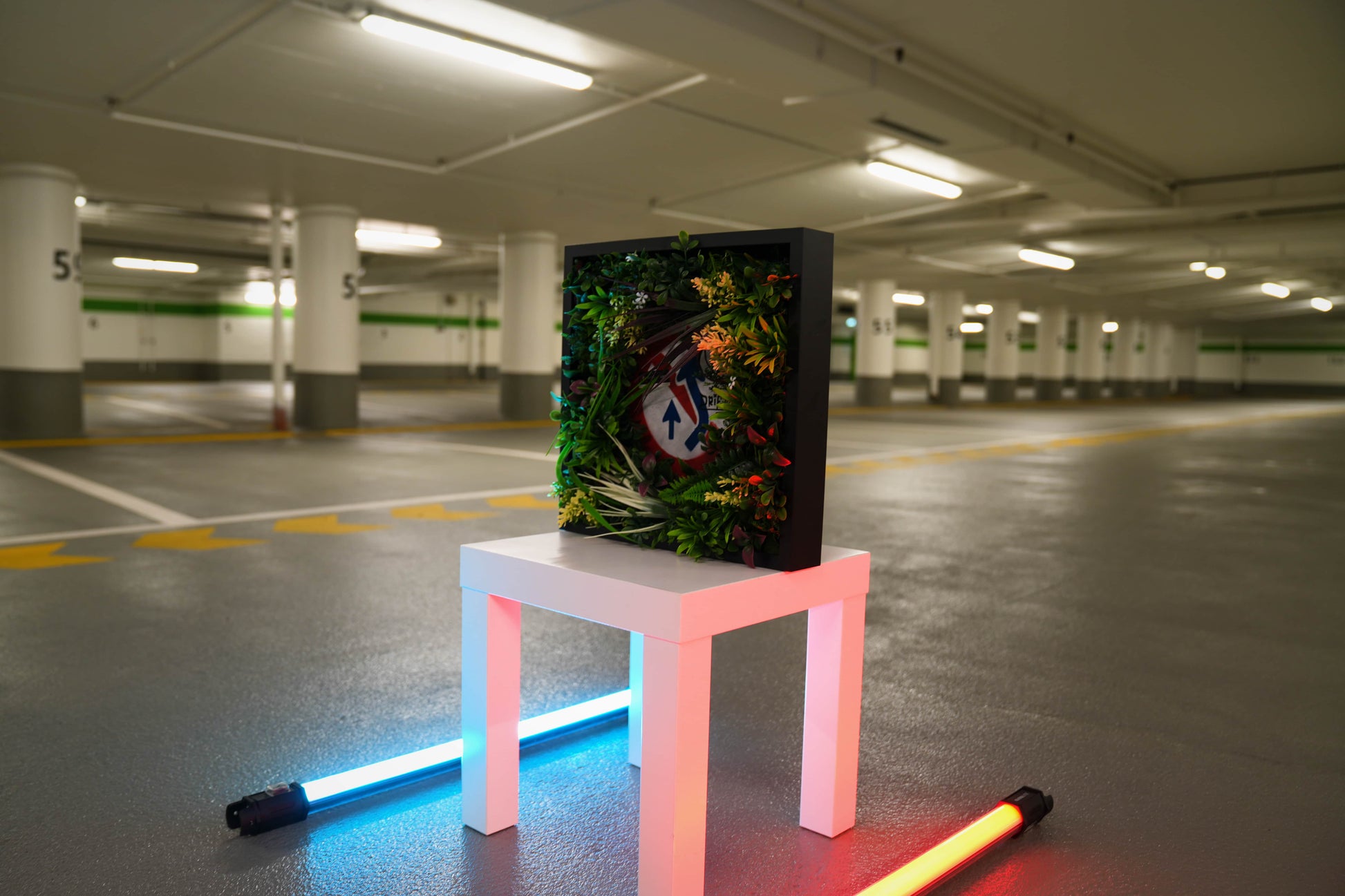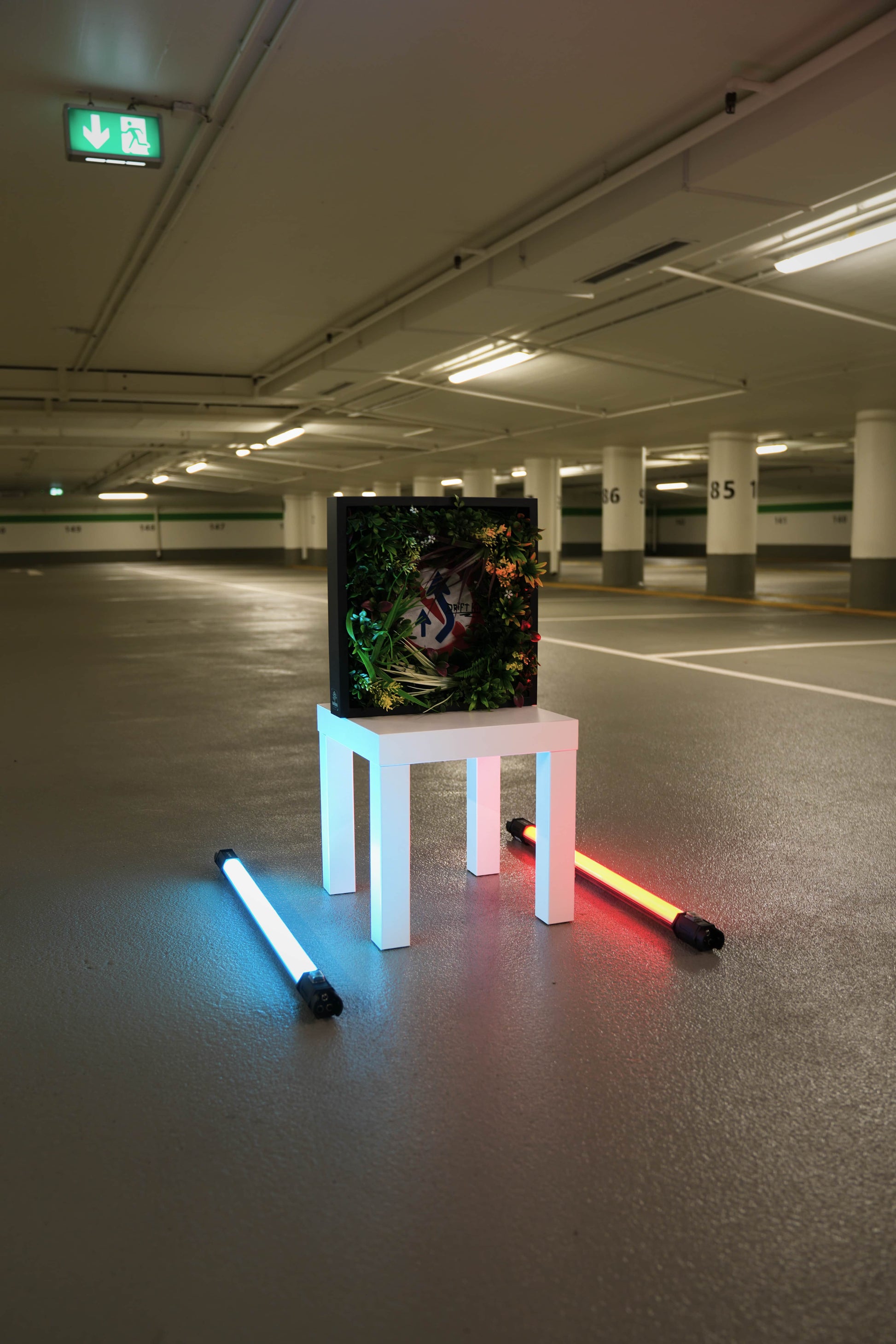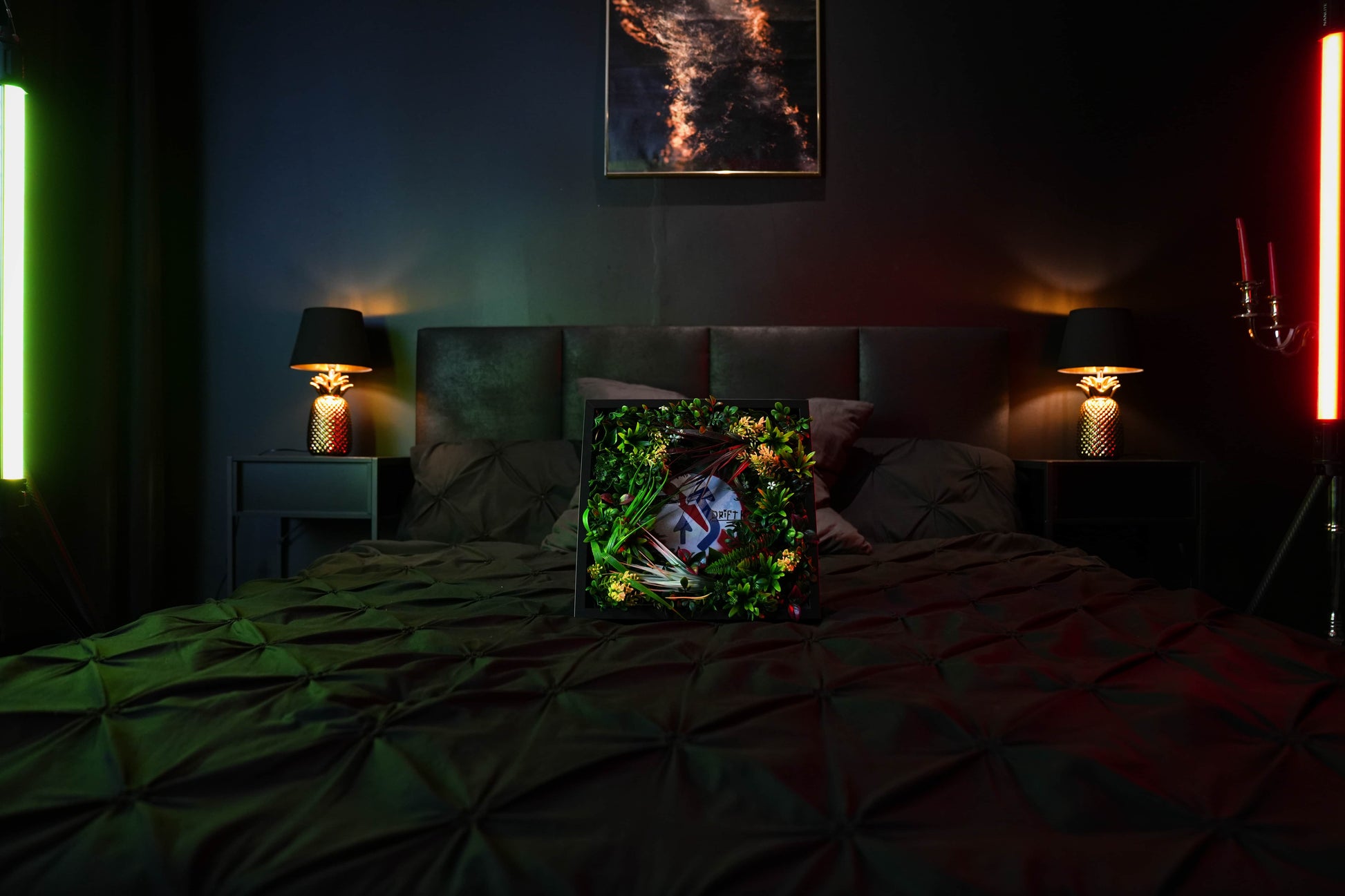 This piece features a hand-sprayed vintage Japanese street sign, evoking the spirit of "DRIFT KING" and the excitement of illegal drifting. Surrounded by a lush array of faux greenery, the sign is mounted within a shadow box frame, merging elements of street culture and nature. The vibrant plant accents contrast with the gritty aesthetic of the sign, creating a captivating blend of rebellion and style.