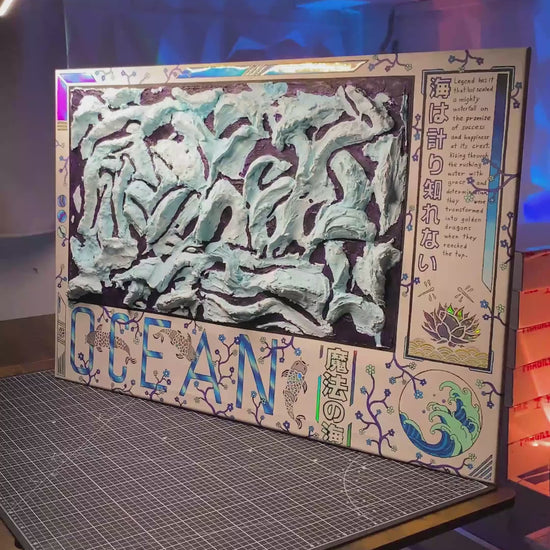 Dive into the magic of the ocean with this one-of-a-kind handmade mixed media artwork. Textured with sculpted waves and detailed with shimmering holographic accents, Japanese calligraphy, and koi fish, this piece tells the legendary story of koi transforming into dragons. Featuring rich colors, intricate line work, and powerful symbolism, it’s a stunning blend of East Asian folklore and modern creativity.