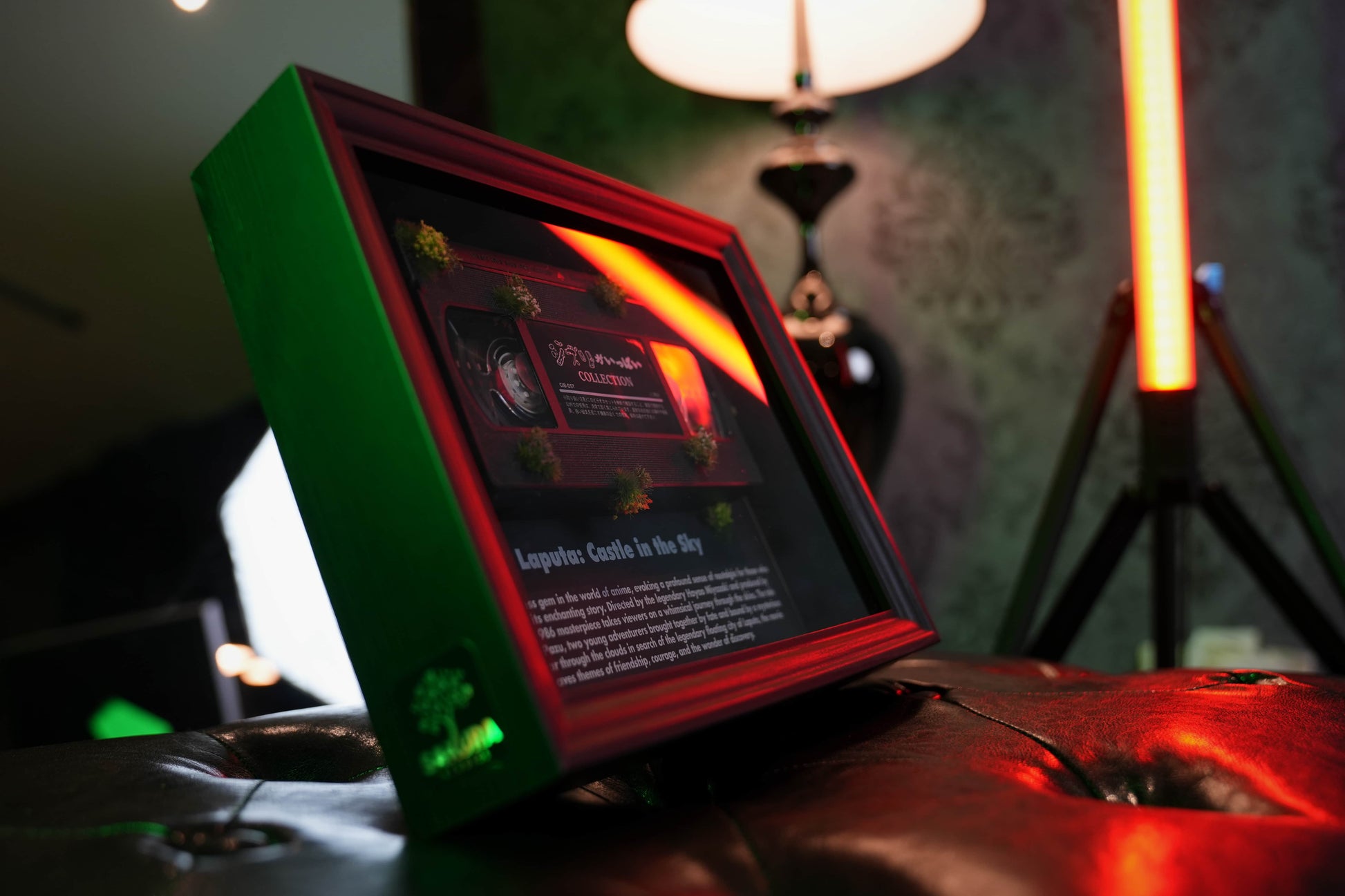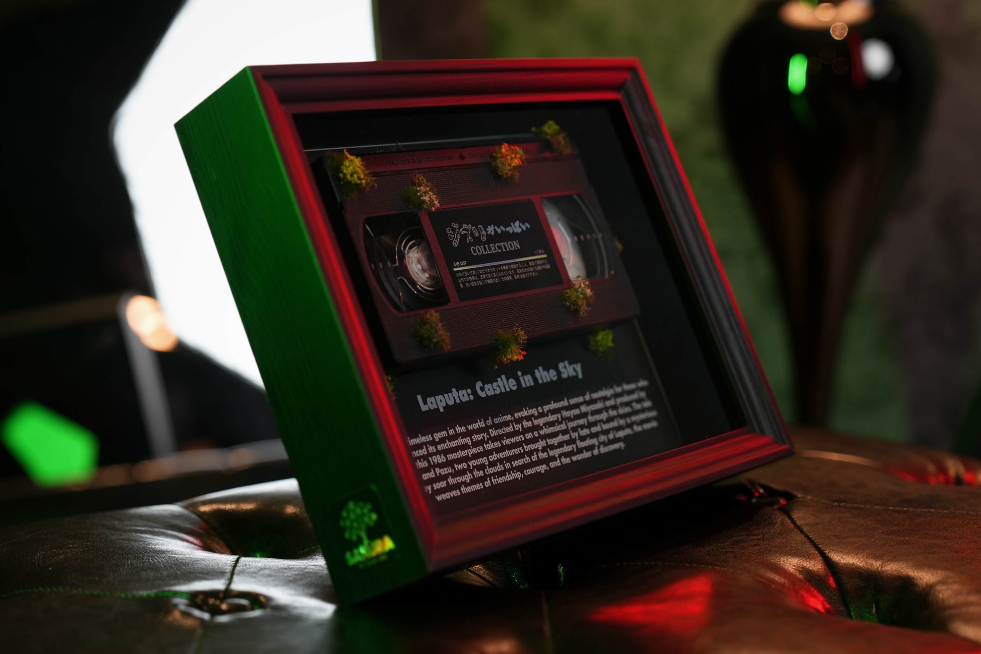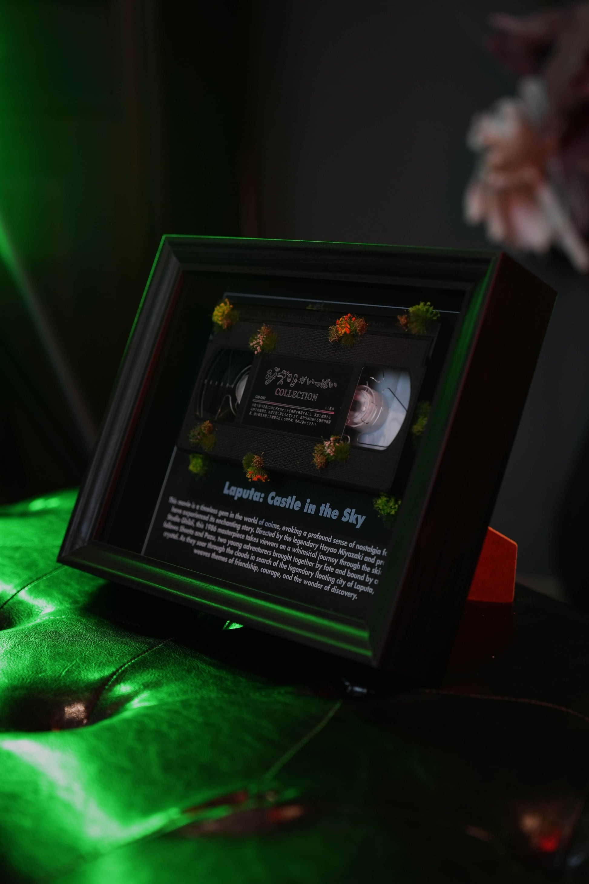 This vintage-inspired framed art piece features the iconic "Laputa: Castle in the Sky" VHS tape, beautifully encased in a striking display. Perfect for anime lovers and collectors, it celebrates the timeless magic of this legendary film. The unique design, complete with moss detailing, evokes the enchanting and whimsical world of the movie, making it a nostalgic and captivating addition to any room.