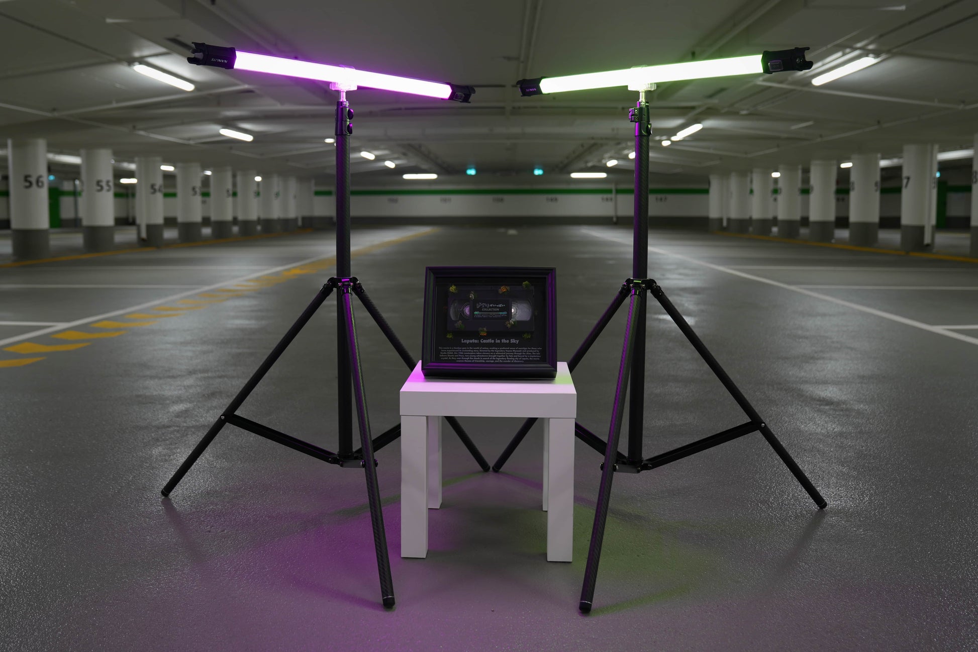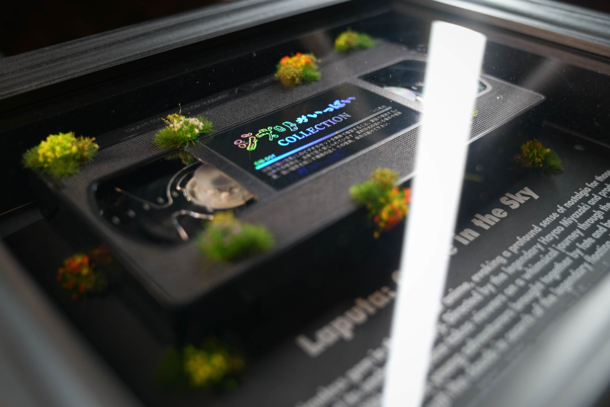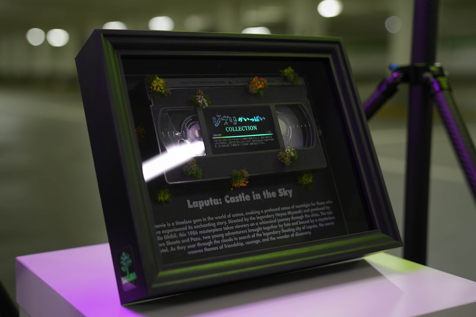This vintage-inspired framed art piece features the iconic "Laputa: Castle in the Sky" VHS tape, beautifully encased in a striking display. Perfect for anime lovers and collectors, it celebrates the timeless magic of this legendary film. The unique design, complete with moss detailing, evokes the enchanting and whimsical world of the movie, making it a nostalgic and captivating addition to any room.