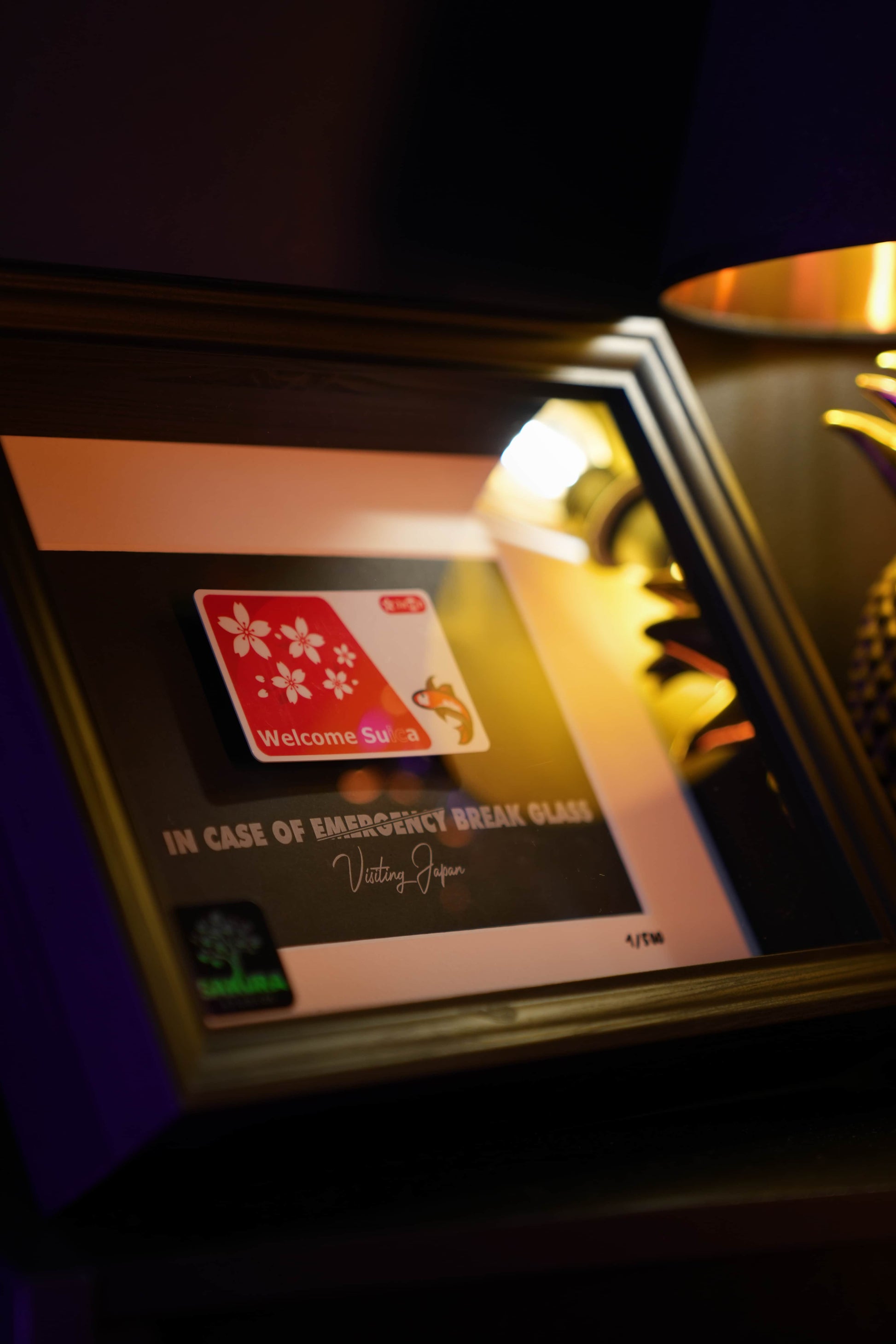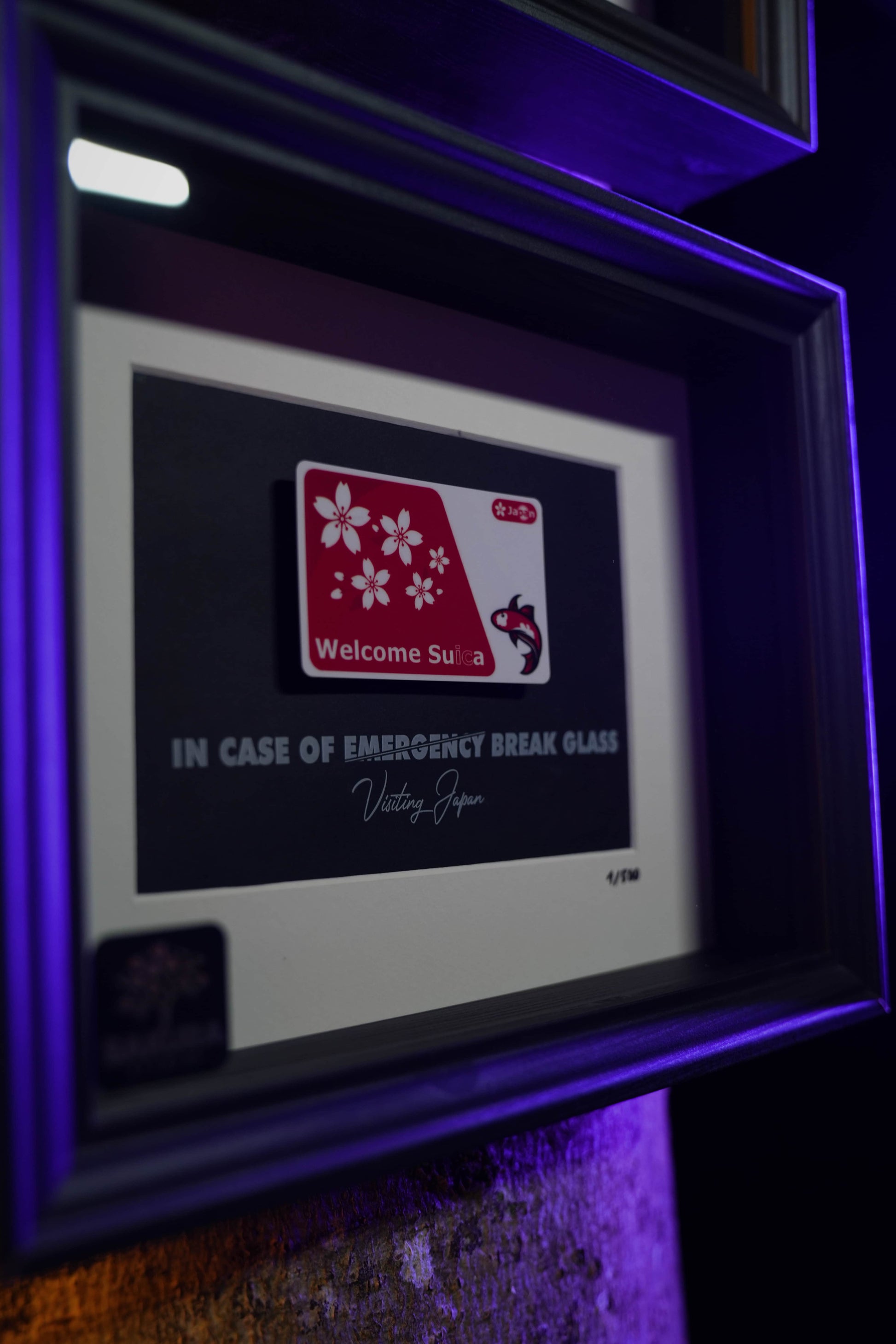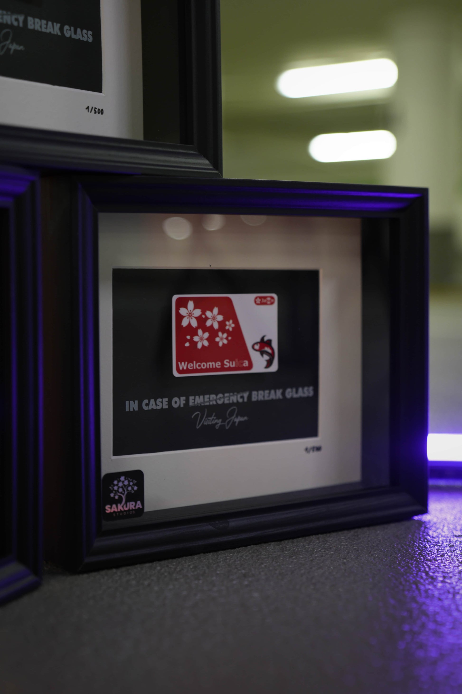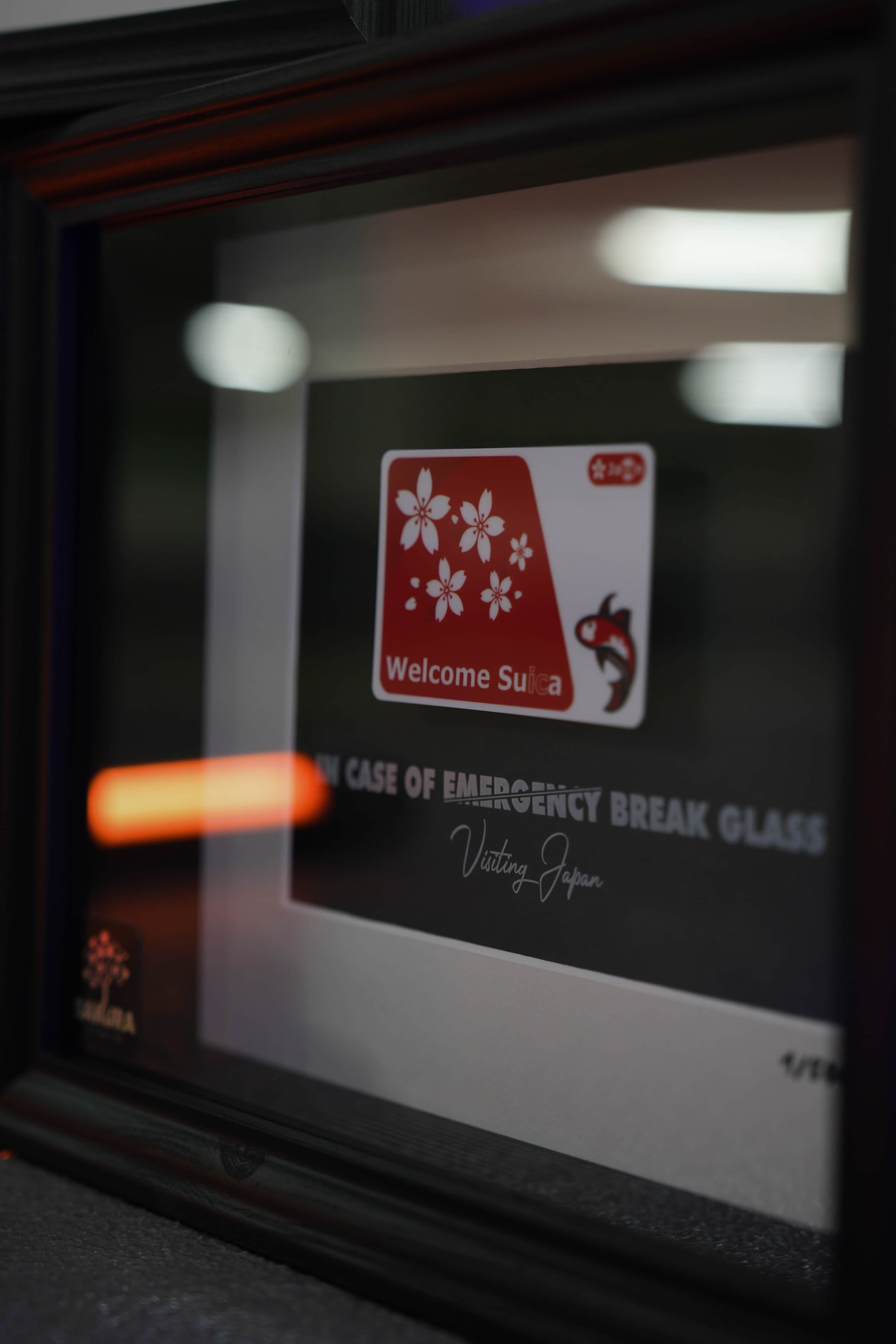 This framed artwork, inspired by Japan's iconic SUICA card, features a detailed design of a koi fish alongside elegant sakura blossoms. The koi fish, a symbol of perseverance and strength in Japanese culture, swims gracefully across the card, embodying the spirit of resilience and beauty. With the phrase "In Case of Travelling Japan – Break Glass," this piece is perfect for adding a cultural and artistic touch to any room, ideal for lovers of Japan and its rich traditions.