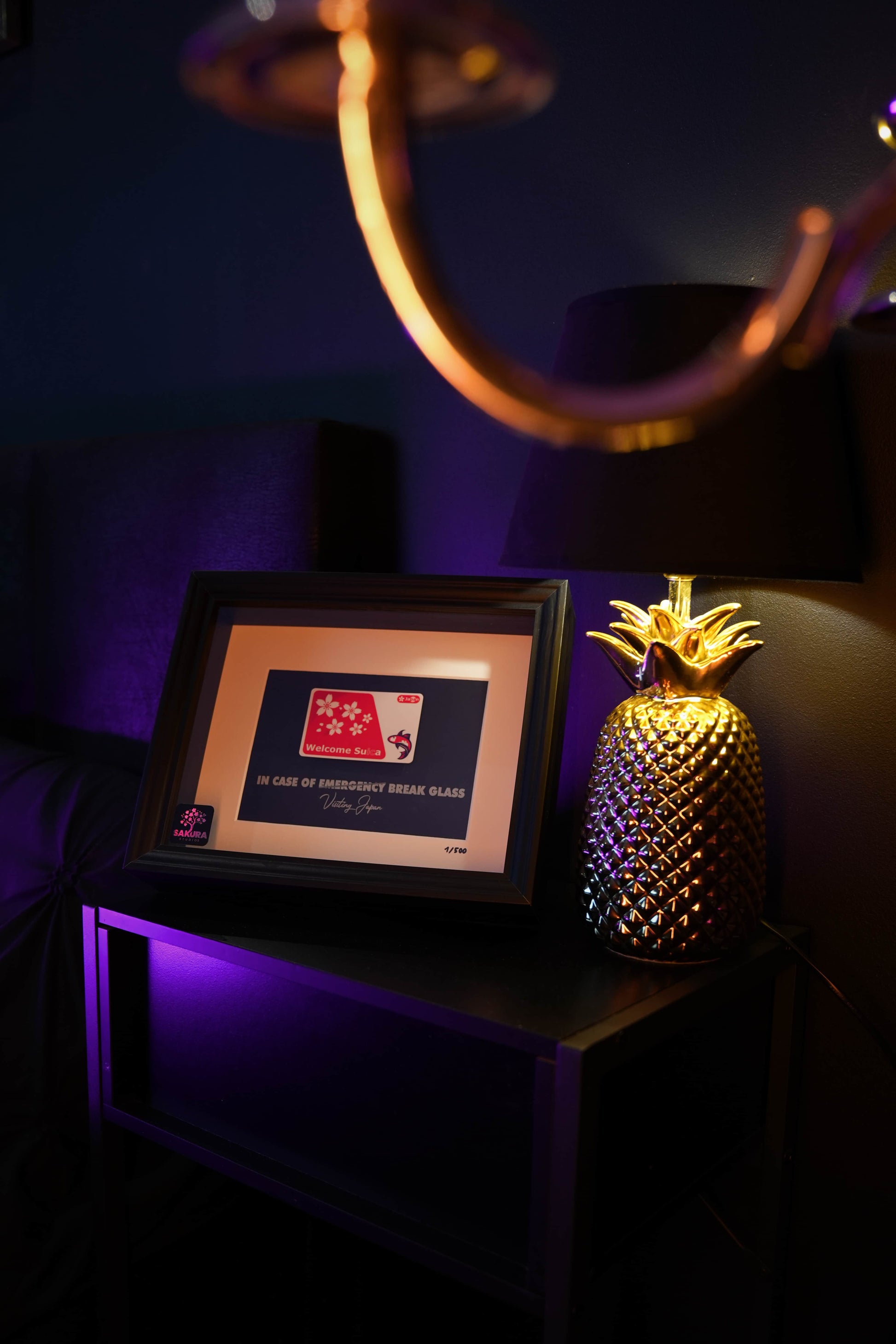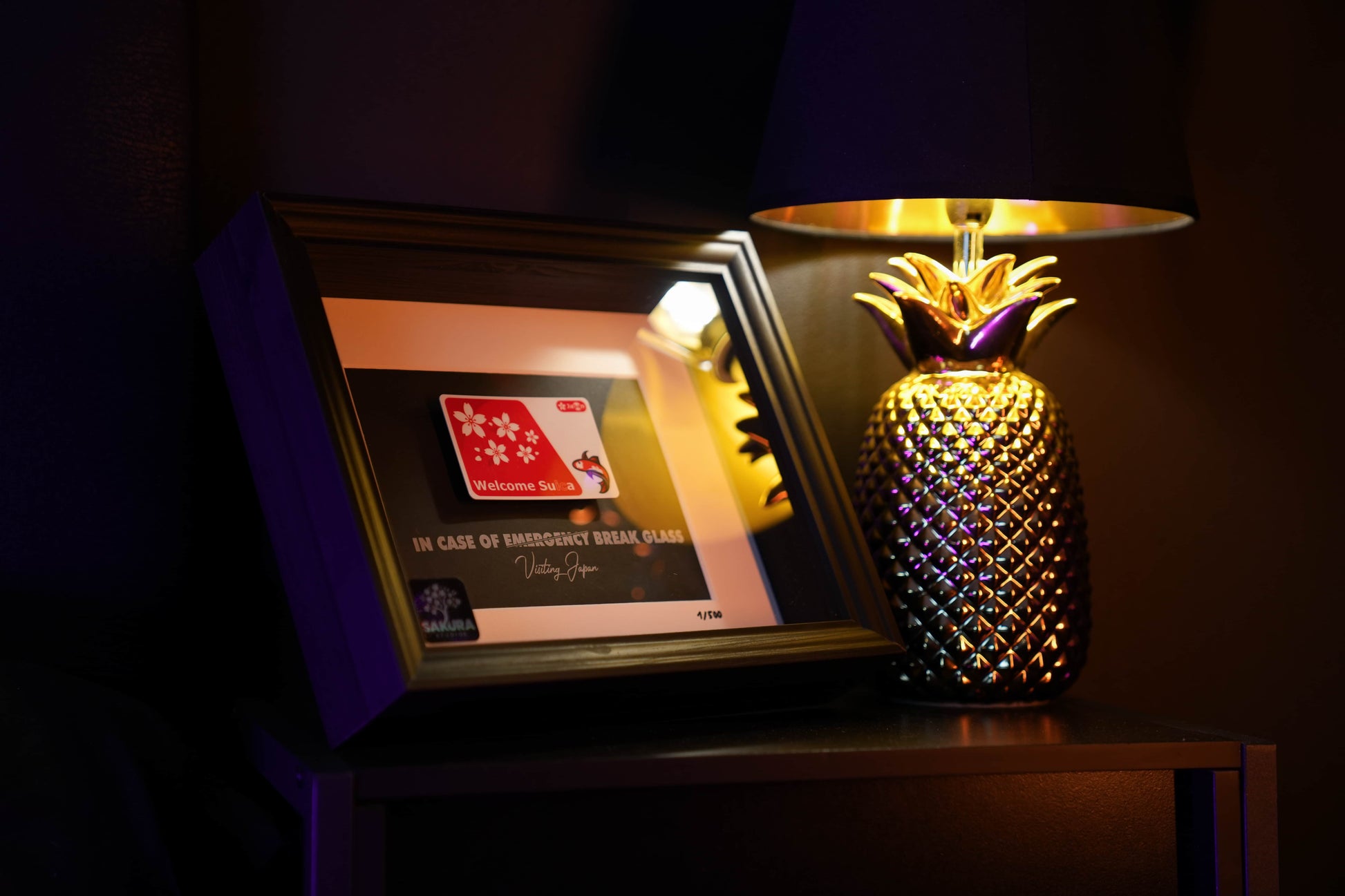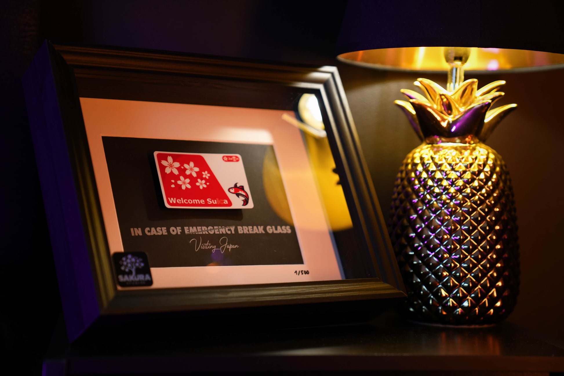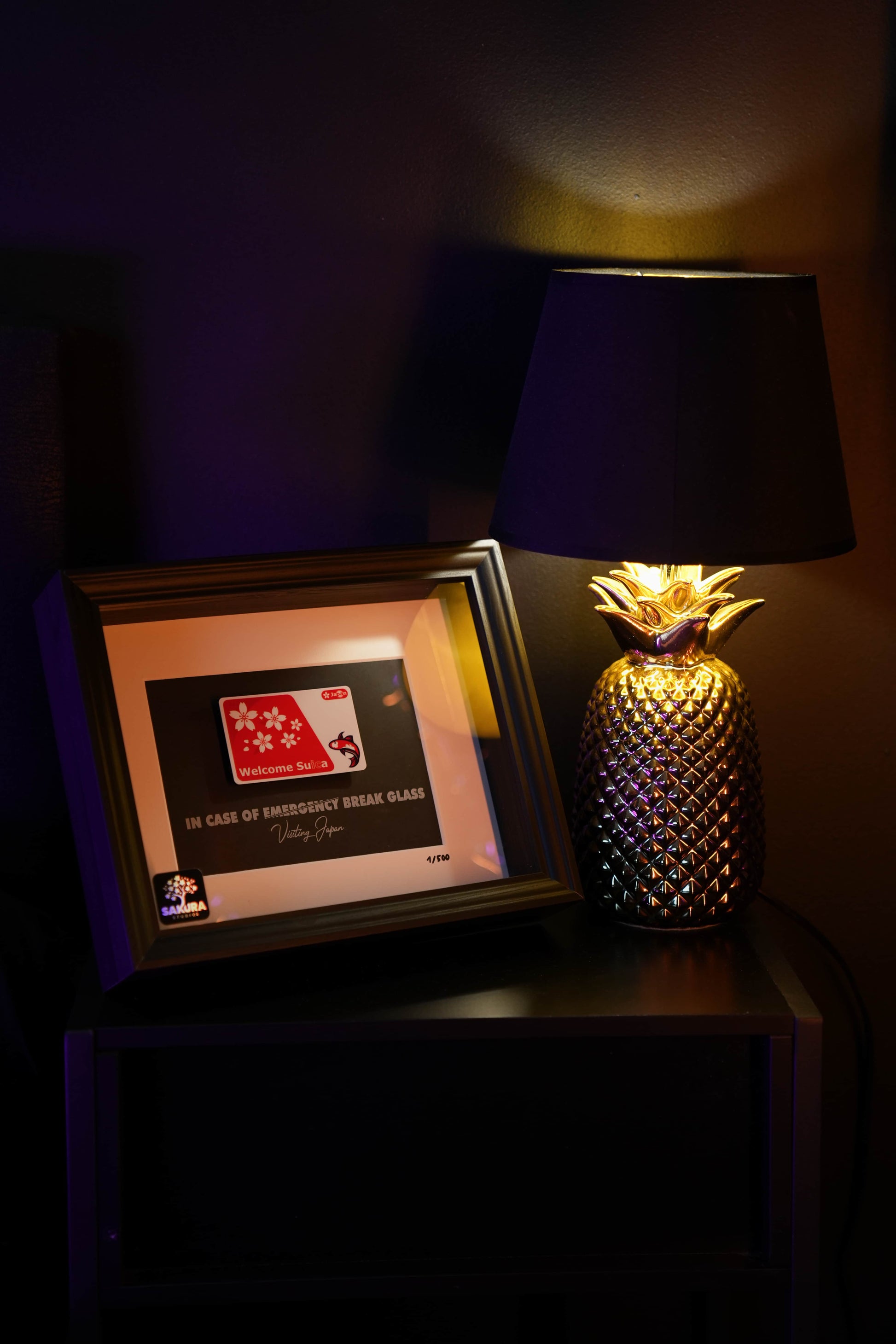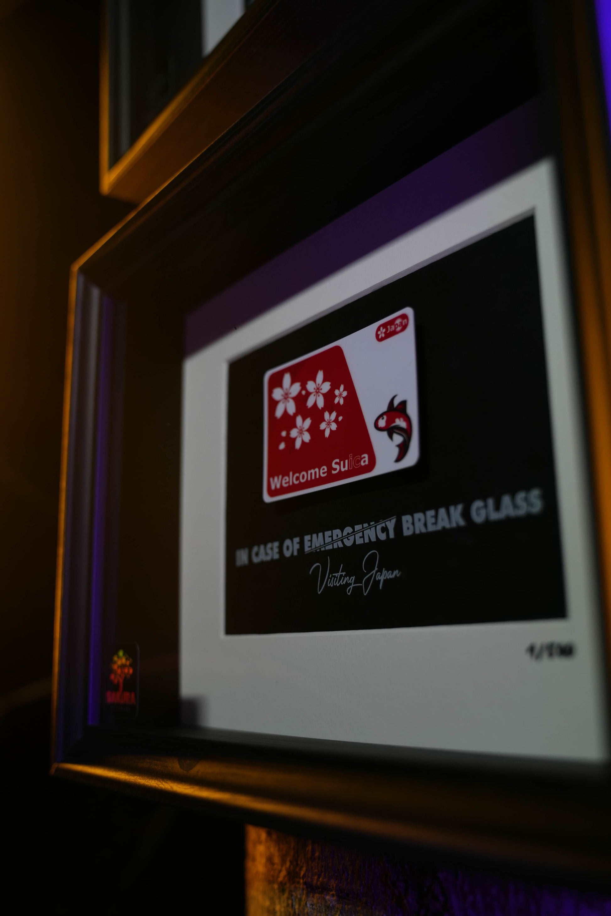 This framed artwork, inspired by Japan's iconic SUICA card, features a detailed design of a koi fish alongside elegant sakura blossoms. The koi fish, a symbol of perseverance and strength in Japanese culture, swims gracefully across the card, embodying the spirit of resilience and beauty. With the phrase "In Case of Travelling Japan – Break Glass," this piece is perfect for adding a cultural and artistic touch to any room, ideal for lovers of Japan and its rich traditions.